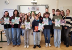 Zur guten Leseleistung gratulierten auch die Elternbeirätin Anja Schilling, die Schülersprecher Sophia Kaesler (10d), Veronika Schneider (10g) und Moritz Kindermann (10a) sowie die Moderatoren Nina Rabenbauer (10c), Anna-Lena Kracher (10c), Antonia Neheider (7c), Lisa Spatz (7c) und Annalena Göres (7c).