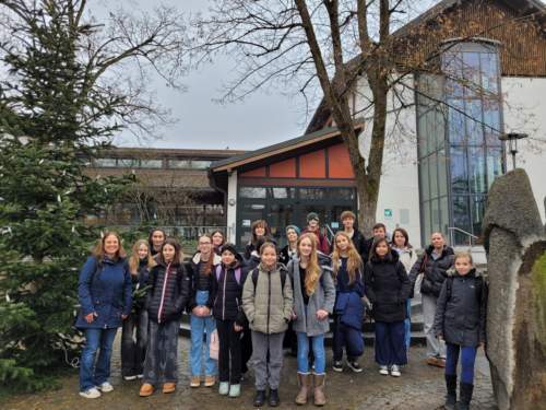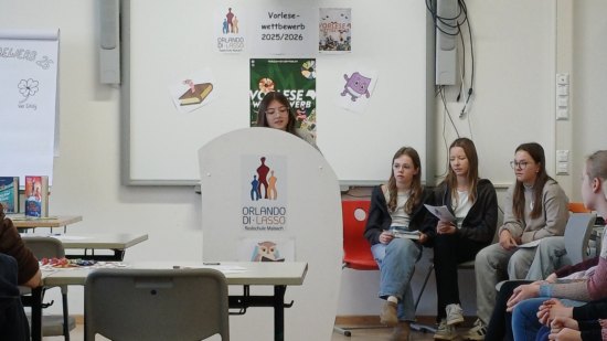 Rahela Ezgeta (erste Reihe, Mitte) aus der Klasse 6b hat am 11.12.2025 den Vorlesewettbewerb gewonnen. Vor ca. 80 Zuhörern setzte sie sich knapp gegen die fünf Mitstreiter durch: Johann Oswald (6d, 2. Platz), Emelie Librizzi (6a I), Lea Dakic (6a II), Valentin Baader (6c) und Lara Gröb (6e). Die Schulleiterin Doris Lux (hinten, 4. v. rechts) überreichte allen Lesern eine Urkunde mit einem Buchgeschenk.
